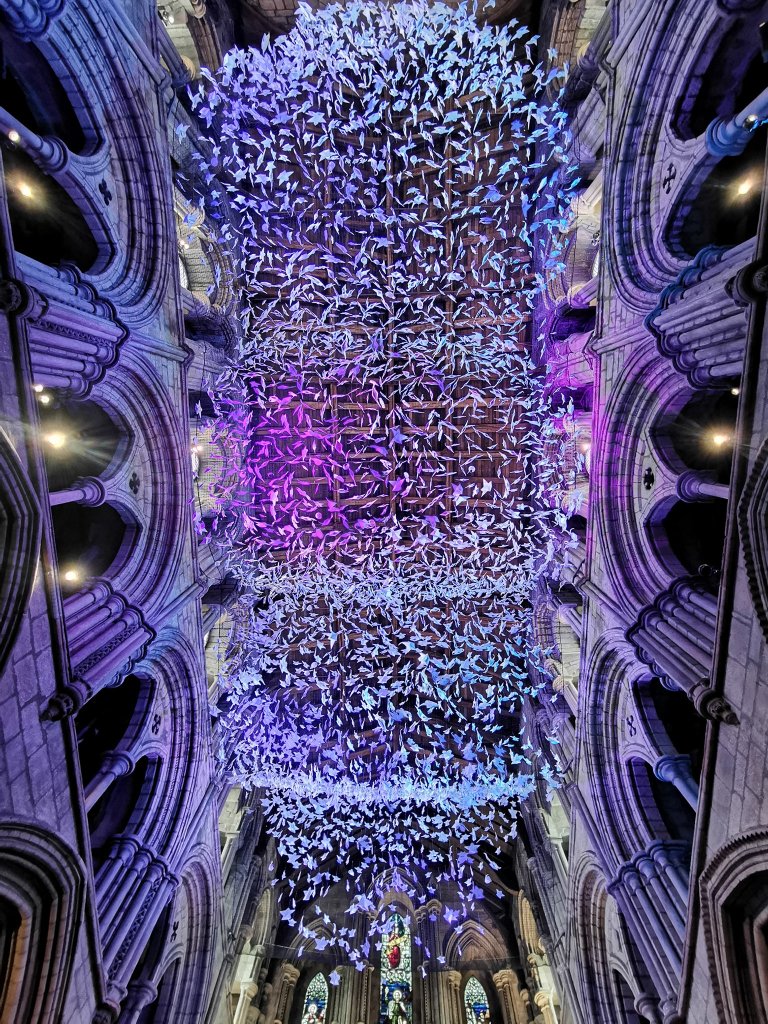 The installation makes up part of the re-opening event for the beautiful abbey church, an opening long anticipated after the last year. During the creation of the installation, up until the day before it was raised, members of the public could come in and dedicate angels to people. The angels themselves became a community project as they were created by volunteers from local communities. The angels themselves make a beautiful display up in the height of the chancel ceiling, lit in multiple colours they appear as an ever changing, though constant and static display.