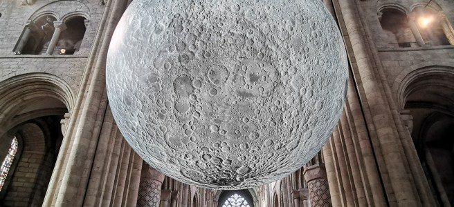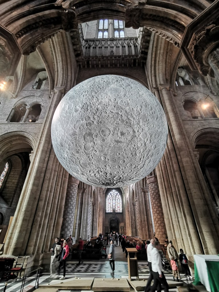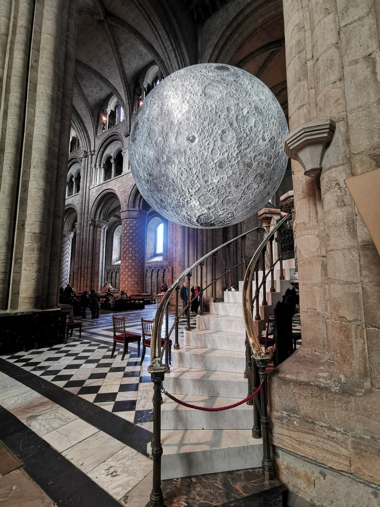 Over the last few years, I have seen photographs from The Museum of the Moon as it has been exhibited in various places around the country, perhaps around the world. Until recently however, I never imagined it would appear in one of the regions local cathedrals. They have created an entrance to the cathedral which shunts everyone through the Lady Chapel first, past much more slender and lightweight architecture than the heavy Romanesque of the cathedral itself. Once inside however, and stood centrally in the nave, the view of the moon directly underneath the tower lantern in the centre of the cathedral is uninterrupted.