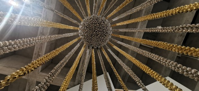 At first glance, looking up the canyon, with its slightly offset walls, seeing these metallic jellyfish style entities hanging there is quite disconcerting. There is a feeling of intrusion into a space where you don’t quite belong, or of a dreamworld where jellyfish roam the skies. On my first visit to this installation, I walked among them, looked up through the tentacles of one, gave another a prod, tapped one of the bells they appeared to be made from and then wandered off slightly bemused at them. On my second visit, a few days later however, I realised that motion, again was a part of this section of the installation, I requested one of the assistants to ‘activate’ it for me, so she set it spinning and gently wafting over a section of floor. The premise seems to be that they have the ability to emit sound, and changeable patters of reflective light at all times, but only do so periodically, adding a more random seeming element to the display. There were several of these hanging through the centre of the gallery, however only one of them was activated between the two times I paid a visit to the work.