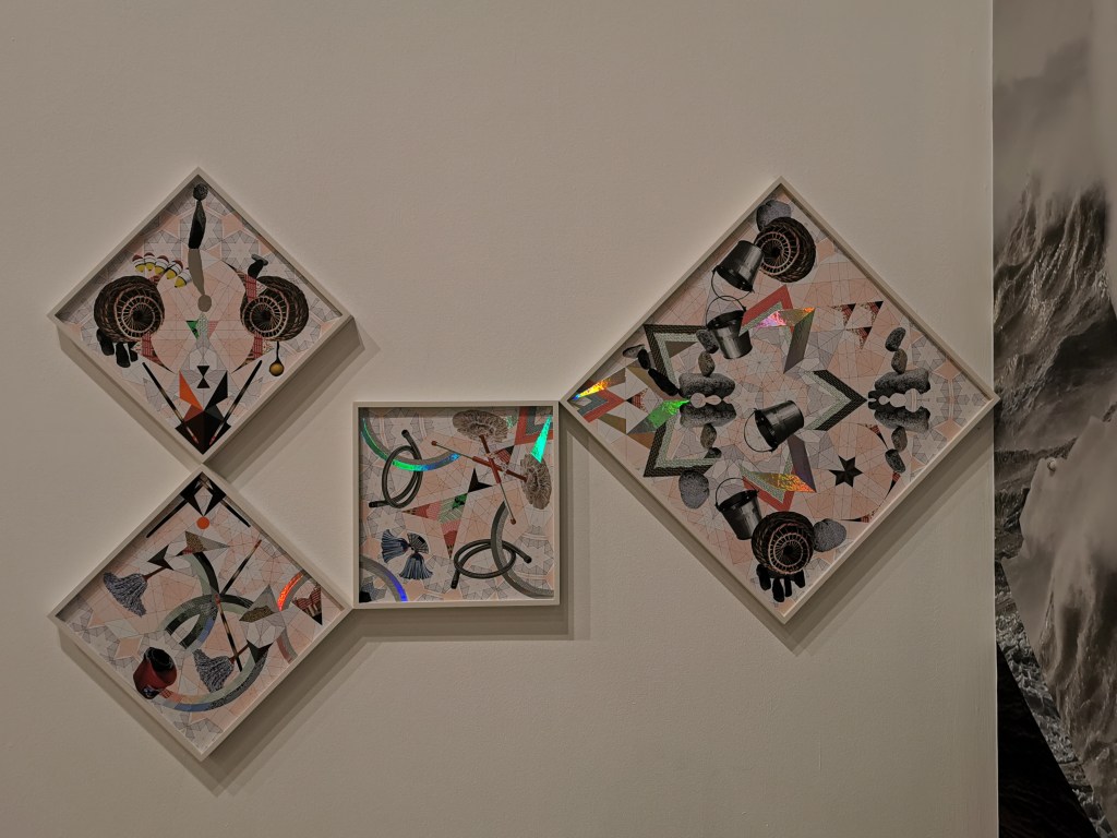 Passing the strangeness of the central arrangement, with its ethereal vision, we come next to an arrangement of what are referred to as “Mundus” cushions, each with a different space themed design, these are arranged on a structure which looks like stacked Prie-Dieu shoved towards the corner of a church, but in a gallery setting instead. The usage of the space themes as opposed to ecclesiastical is quite intriguing, but appears to fit well with some of the other artwork, helping to tie together the overall theme of the installation itself as to do with strange attractors. Following this, my walk around the space took in the main picture wall, which has various local scenes, artists and weather events all intermeshed together, as though they were one overarching narrative taking up an entire third of the wall space of the entire large gallery. While it was a bit of a muddle, it did kind of have a general thematic trend running throughout, with strange voids, circles and other shapes within.