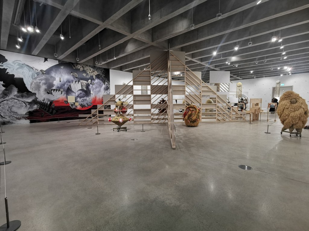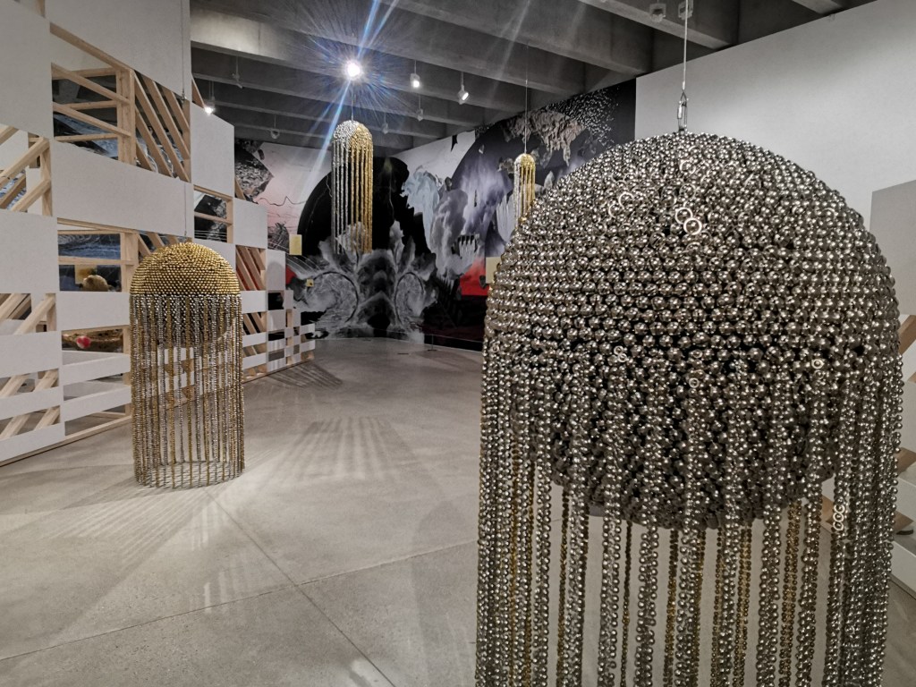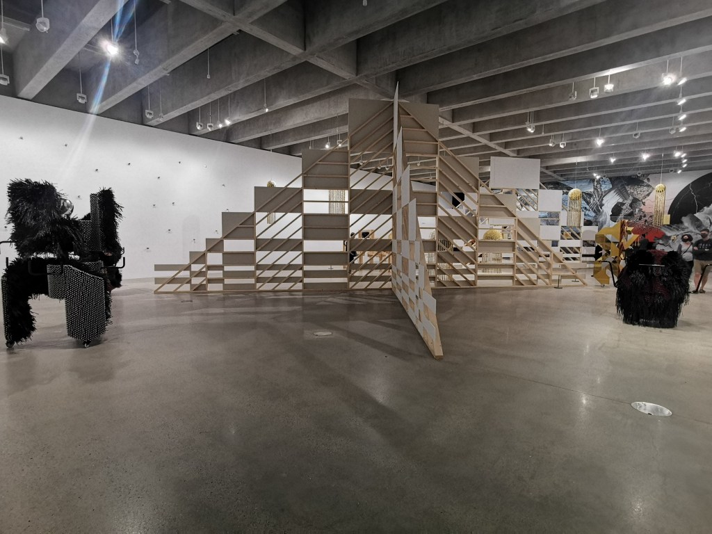 While initially to the unprepared invader of this space, it feels daunting and overwhelming, that feeling soon vanishes to be replaced with a sense of wonder at the fantastical scene. The first engagement with the installation is to wonder upon the open space containing two animalesque effigies with the pyramidal structure behind. They kind of stop you in your tracks as you take in the scene. These raggedy looking dark sculptures are Yang’s take on ideas by other artists who have visited St. Ives, the smaller one on the right in the photo is her take on Li Yuan-Chia (Untitled 1993) and the other is in reference to work by Naum Gabo. The second of them has a head and torso that can be made to spin giving the evocative scene of a primitive native dancer gyrating within the gallery space. Both of the artists referenced in these sculptures have previously had work exhibited in and around St Ives in the past. Moving around the gallery, away from these oddities, we step abound the pyramidal structure to look up a canyon created centrally in the gallery space to house the cluster of Sonic Half Moons.