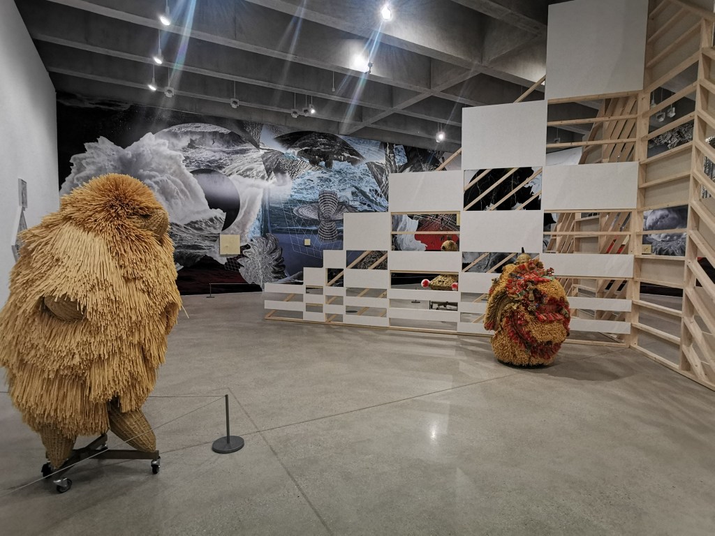 In the final section of the gallery space, nestled beside what I shall refer to as the feature wall, there is another selection of intermediaries, these ones are made from straw with inclusions and have more quirky individual titles like Running firecracker, and Tilted Bushy Lumpy Bumpy both made in 2016. Neither of these move, unlike some of the other pieces in the room, but unlike those, there is a certain naturalistic style inherent in the construction, reminiscent of both thatched rooves, and in a way, basket weaving with some inclusions in the weave. They appear static in the room, but as objects of veneration within the temple of art, gathering in attention from those in the room. There is a lot of conflict amongst the miscellany of pieces of individual work in this exhibition for such a limited amount of attention, and as I noted within the room, that attention is lavished on different things by different visitors, so in a way, two different visitors may take away two completely different ideas of what the exhibition is about from each other.