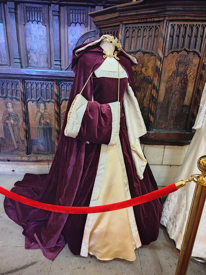 Those two share their space in the heart of the church with the 1920s wedding dress by Coco Chanel which was created in the then-fashionable Flapper style. Personally, this one is not something that I would consider an appealing garment, though that’s mostly personal bias as the fashion style is over a century old now. However, the other dress that is standing in the same area is a self-designed dress, it was designed and created by Catherine Hutton who wore it at her wedding in 2001 in Easington Village, County Durham. Although self-designed, it was professionally made within the setting of a bridal shop. The design itself was based on that of a dress in a portrait of Jane Seymore (1508-37), wife of Henry VIII, because of its red colour and its semi-medieval design, the curators thought to place it in front of the screen with lots of Hexham Abbey’s medieval paintings, in this position it looks absolutely amazing.