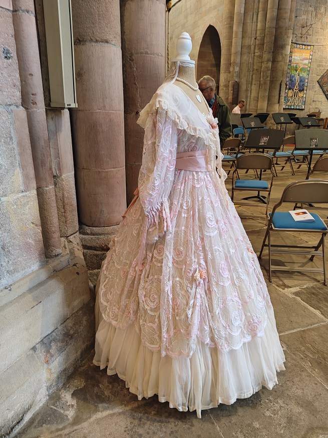 The final stretch of the exhibition is hidden away in the Cloister Porch at the end of the nave. If it wasn’t for a couple of pieces of furniture, this scene could almost look like a bridal shop display room. This part of the exhibition contained a number of beautiful items and different styles, walking through there and examining each one while reading the small amount of information in the exhibition guide helped to bring these to life for me.