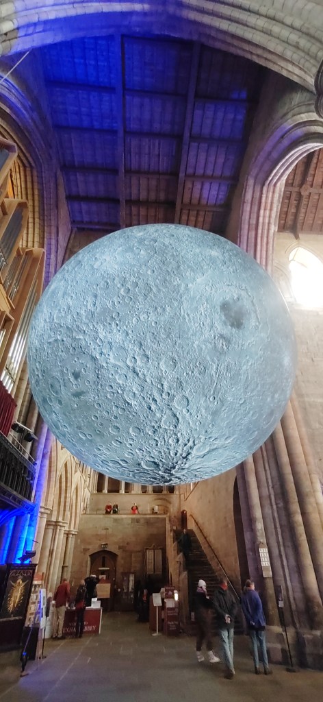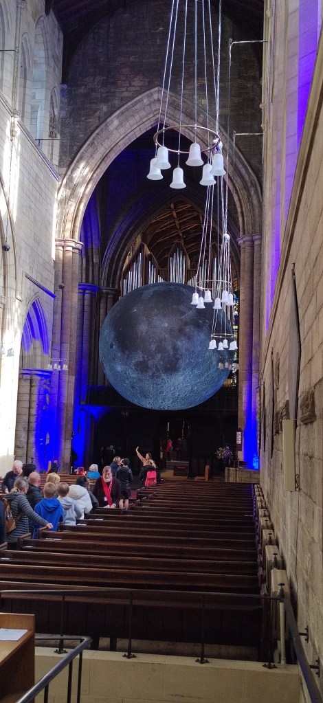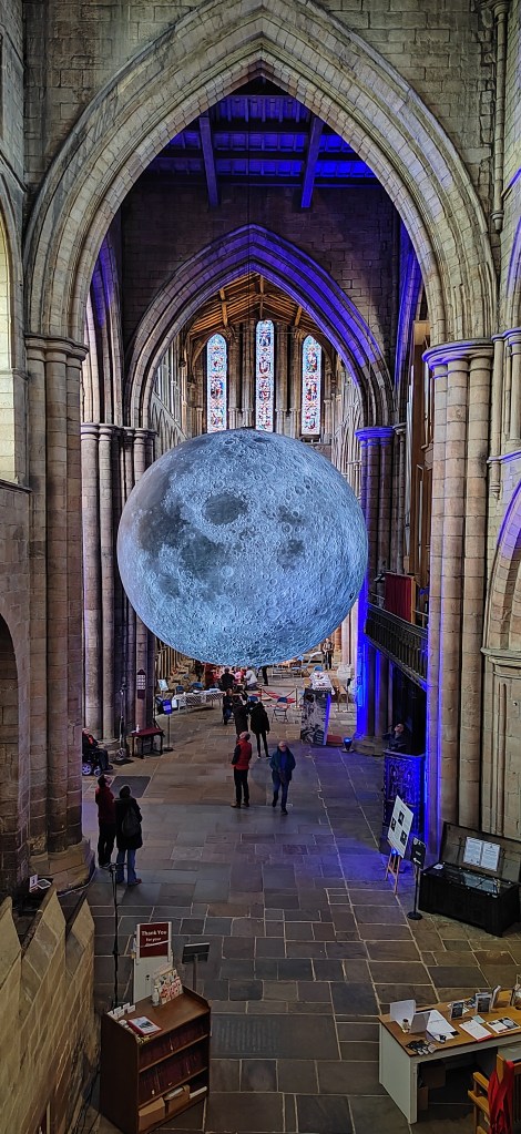 In Hexham Abbey, as with various other cathedrals, the Moon has been hung in the crossing between the Nave, Choir, and Transcepts meaning it can be viewed from multiple angles and seen from more than three-quarters of the inside of the church itself. As seen in the first photograph, when I popped in, the nave of the Abbey was extremely busy with quite a lot of people viewing from there and taking photographs in front of the moon.