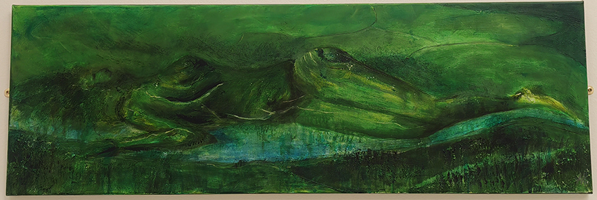 My overall favourite artwork from this exhibition is Annie Kennerley’s absolutely beautiful work ‘The Lady of Northumberlandia’ which she has created through a combination of Mixed Media, Acrylic and Ink.  Northumberlandia as imagined here is less of an abstract concept and earthwork construction, but instead, she is shown as a woman, or perhaps a giantess slumbering within the landscape, she becomes a giant sleeping goddess rather than an earthwork project.  Looking at Annie’s artwork it appears true to the shape of the earthwork that she has engaged with.  Taking on the profile of the artwork Northumberlandia as viewed from the south, with her looking as she would within the wider landscape itself.  I absolutely adore the green colour tones of this artwork, the monochrome image with a textured appearance really makes her stand out better than if this had been a more traditionally coloured picture.  There isn’t really anything in the picture to hint at the scale of the sleeping woman, so if you didn’t know how large Northumberlandia was, you could be forgiven for thinking that this was just an ordinary-sized woman lying in the grass.