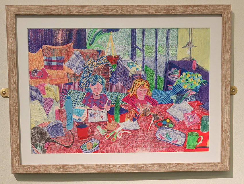 Tenth for me is Helen Bradley’s ‘Painting at the Kitchen Table’, created using Pastels and Ballpoint pen.  I quite like the idea of people sitting around together creating something, it feels quite cosy.   This idea of slow collaborative creation is something fast becoming lost to modern society.  This work has a cosy, homely feeling to it with comfort and individuality expressed through the clutter of objects not only on the table but also in the surrounding room.  When I first saw this artwork, and the one below, I initially thought that it looked similar in composition to one of Grayson Perry’s tapestries from his “Vanity of Small Things” exhibition, but on a much smaller scale.  While this picture doesn’t have the same purposeful and overt symbolism, it does however convey a powerful sense of togetherness and camaraderie as the two people in the artwork just spend time together.