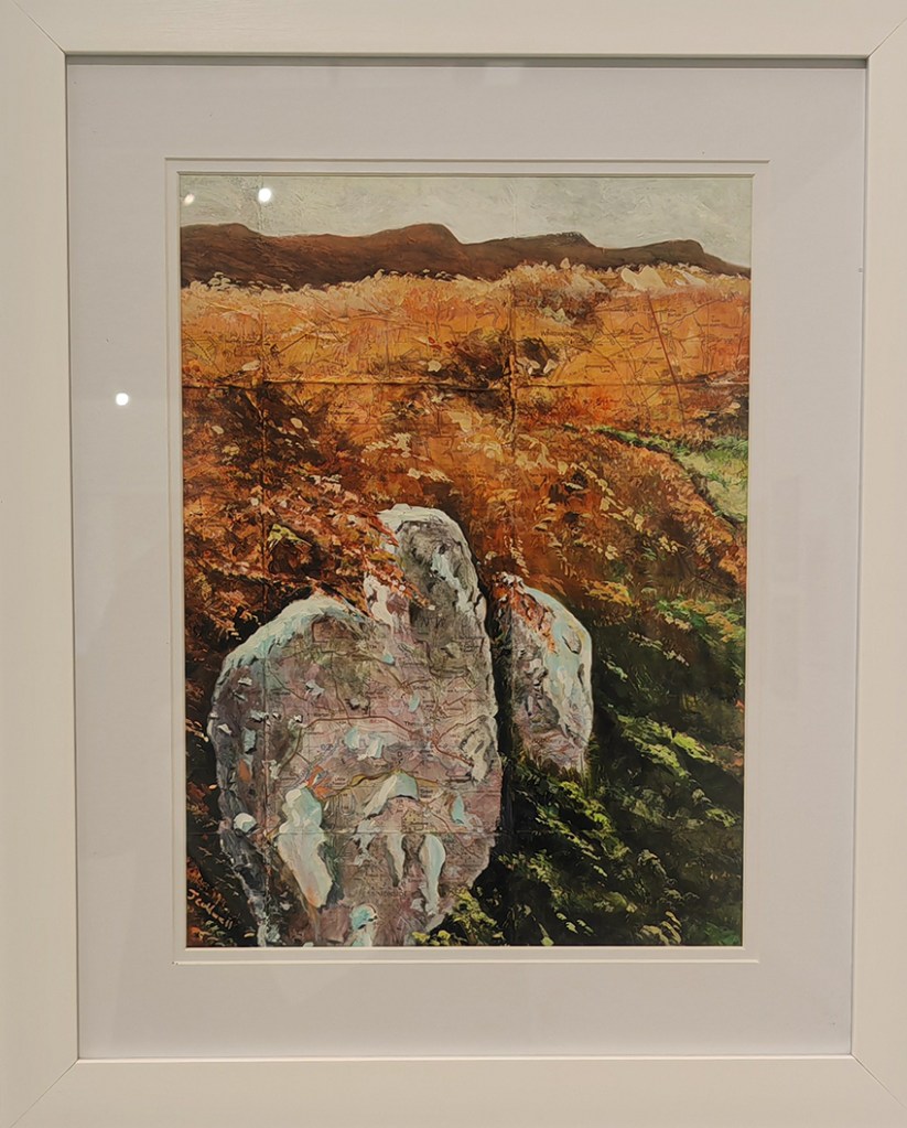 My choice as my second favourite is a painting that really speaks to me.  Its subject – ancient stones – is something that I take a personal interest in, and I regularly go to visit collections of them.  Jean Coldwell’s fabulous artwork ‘Golden Garliemoor, Timeless Stones, Same Then as Now’ is a charming painting which has been executed on the surface of an ordnance survey map.  Having parts of the map visible through some of the paint is a nice way to reinforce that these stones make up a part of the landscape and that it wouldn’t be the same without them.  The stones themselves dominate the foreground of the painting; they occupy a landscape which looks as though it may become overgrown at some point in the near future.  The encroaching vegetation blocks out the view of any more landscape save for the hills at the very top of the picture space.  The composition of the picture forces you to interact with the stones and to wonder for what purpose they were placed within this landscape.