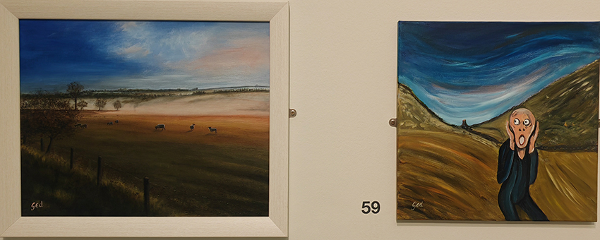 I really liked these two pictures which is why I decided that they should be my third favourite of this exhibition.  Both of these pictures manage to show a completely different image of Northumberland as it is ‘now’ in two completely different yet complementary styles.  These are both by Ged Livingstone, ‘The Lee Sidings Hay Field’ and ‘Sycamore Gap (Sans Sycamore)’, both painted in acrylic.  The first of these images shows a sleepy rural scene, one typical of Northumberland with sheep grazing idly in a field.  The lighting on the clouds and mist hint at this scene being early in the morning.  The different areas of the painting blend together through a gradual difference in tonality, leading the eye out from the darkness into the light.   The other artwork however could not be a more different scene, the sense of tranquillity that should be associated with the location pictured has been savagely snatched away, the peace shatteredThe man in the impressionist style depiction of Sycamore Gap is standing in the same pose as; and looks similar to that in Edward Munch’s ‘Scream’.  The act of a scream here could be symbolic of many things, like the ending of a life, or the desecration of a cultural icon that is deeply rooted within the collective conscience of the area’s unique culture.  This painting is very apt for the moment in Northumberland’s story.