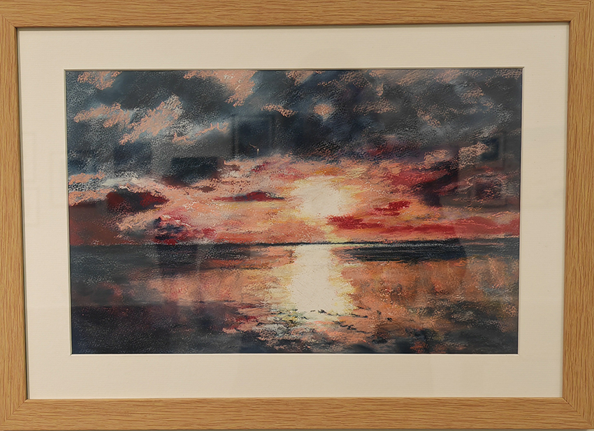 My fourth favourite of the exhibition is Janice Mack’s lovely ‘Cresswell Sunrise’, which she has created through a brilliant use of pastel and charcoal.  This blend of different mediums creates a fantastic mix of subtle light colours, effects, and deep darkness, giving the artist the ability to really play around with the light in a way that wouldn’t be possible with other mediums.  I was particularly drawn to this artwork because I really liked the subtle blend of colours within the clouds in the sky.  The ruddy red and the grey are especially vibrant.  The brightness of the sun, just as in nature is quite overpowering on the seawater.  This effect combined with the low horizon creates a substantial feeling of openness, excitement, and warmth within the picture.  The whole composition, surrounded almost by the slowly retreating darkness is very engaging indeed.