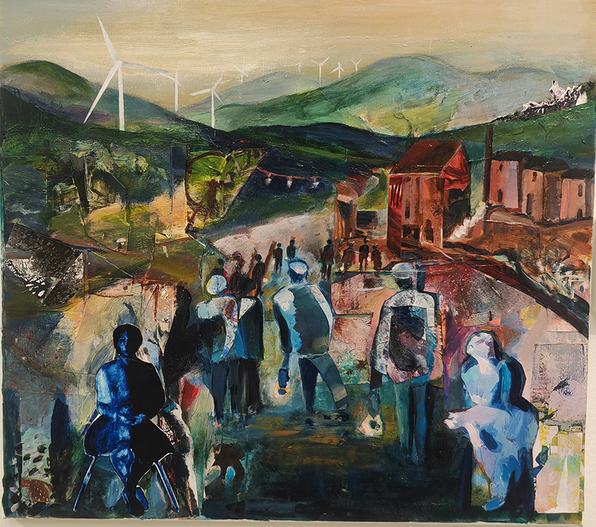 For my personal sixth I chose Judy Seymore’s ‘Now and Then’, this colourful mixed media piece has packed a lot of imagery into a relatively small artwork.  This picture demonstrates a progression from the old to the new in terms of power.  In this scene, the industrial past is at the bottom of the image and shows the workers going out to work in the mines.  This is now largely seen as a thing of the past, though it is thoroughly engrained into the very fabric of the regional psyche.  The buildings in the middle are a darkish red, as though covered in the dust, dirt and grime that result from the industrial processes that take place inside them.  It is almost as though the space outside of those buildings was seen as not relevant or worth taking care of by the businesses inside.  The top portion of the painting ostensibly shows a new green culture which is supported by environmentally friendly power; however, this fails to engage with the direct destruction and habitat loss which is caused when putting the windmills into the countryside in the first place.   Altogether, I think that this artwork is a marvellous concept, bringing together a range of differing elements into a cohesive and challenging whole and the resultant image just works.