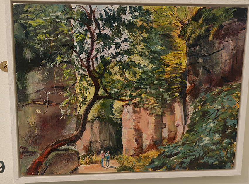 Seventh is Cynthia Davidson’s painting, ‘The Quarry Garden I’, made with acrylic on a wood panel.  This piece appeals to me because it’s a place that I am quite familiar with and which I have visited on many occasions over the years.  I adore how the artist has used the negative space of the rock faces on both sides of the picture space to frame the inside of the quarry garden.  The couple which she has included stood in the centre of the quarry are ideally placed to demonstrate the scale of the faces of quarry walls surrounding them.  The overly large cliffs give an excellent sense of seclusion to the space, this is only emphasised by the tree at one side of the painting and the bush at the other side.  The open space in which the couple stands, like actors in a theatre, is a great counterpart to the enclosed feeling that comes from being between those cliffs.