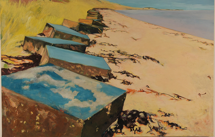 My personal ninth is Anita Brian Tyrrell’s work ‘Druridge’, which she has created from acrylic on Canvas.  This painting has a quite interesting composition – the old concrete block anti-tank defences sit in a nice line, leading the eye from the bottom corner of the artwork through the middle distance of the picture space to a point where they blend together with the sand dunes below the sky.  This gives the eye a feature to rest on and the ability to judge scale.  This leads to the revelation that this beach is a lot bigger than a short glance suggests it to be.  Those blocks also seem to take on the appearance of a demarcation between seashore and land, surrounded as they are by seaweed, they are a final line of protection now for those dunes from the advancing sea.  I quite like the use of a minimal quantity of sky in the scene as this opens out the picture, giving it a nice balance.