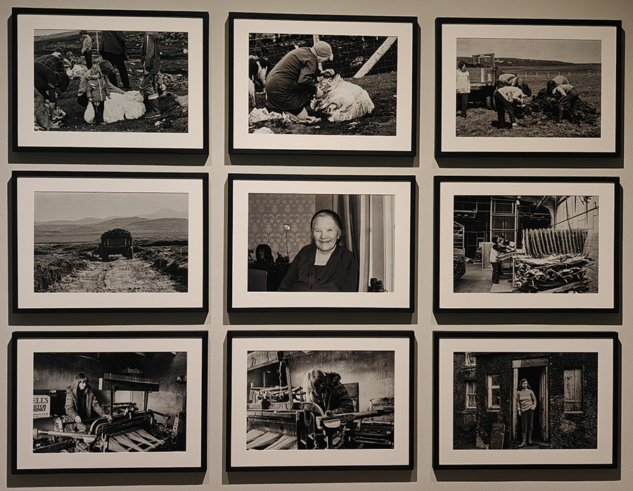 On the wall opposite to the contextual information about Franki Raffles, there are shots from two of her earliest bodies of work. Each of these sets of work are placed separately, with a little information about the context in which the images were taken. There are only nine photographs in the section on Lewis, but between them, they illustrate a story of the working life of women on the island. The images show work out in the fields with the sheep, one lady even using a manual hand scissor to shear a sheep. This would have been a tough job for most people and would certainly have destroyed the view of island life as being an easy life within a scenic idyll. Raffles didn’t just show the working conditions either, there is a picture with a run-down house that has a boarded window; this picture isn’t saying that all housing on Lewis was in this state but suggests that the condition of housing here has generally less cared for.
