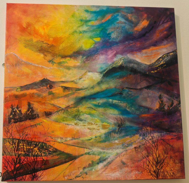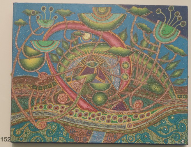 This colourful and vibrant offering by Geoff Hudson, called Dreamscape stands out well from the other artworks on the wall. It is a fantastical image in itself, beautifully abstract and eye catching, the colour, pointillism and intense patterning which the artist has used has really elevated this painting to another level, making it stand out from the crowd.