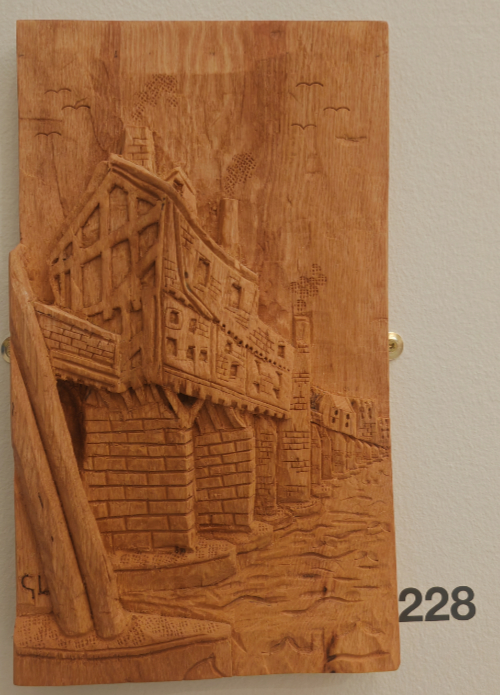 The bridge itself is quite cleverly rendered, George has used a decent amount of foreshortening in the arrangement of structures that sit along the bridge, as well as using a linear perspective to reduce the size of these buildings the further away they are intended to appear from the viewer. The end result is good, the bridge sitting on its many piers with buildings right along the bridge deck has a realistic identity in the third dimension, even though it has been mostly carved in a shallow relief. The end wall of the closest structure has a sturdy and believable architectural build, those beams weren’t just for decoration. The smoke coming from the chimneys on the buildings and the birds in flight in the sky work well alongside the water to bring a sense of life to the whole scene and make it appear less static. The arches of the bridge can be clearly seen, and in fact, there is a remaining arch from this old bridge left in situ beside the swing bridge today. This is a charming carving, and I have included it here because it stands out in this exhibition as a fantastic piece of wood carving.