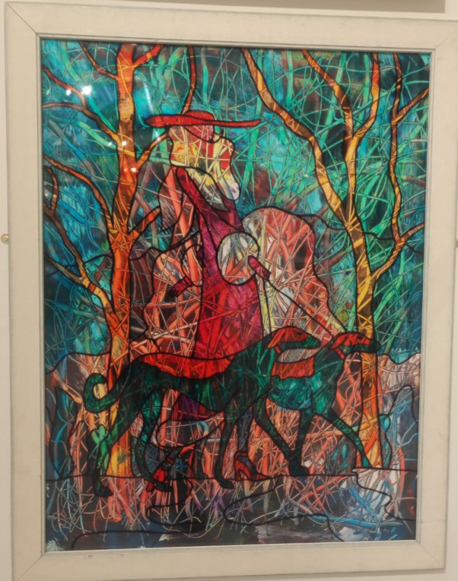 This work is created from Acrylic and Glass Paint and has the presence of a stained glass window. Partially this stained glass effect is created using those thick, powerful, black lines between blocks of colour and to emphasise the edges of objects within the picture, the jewel like colours of the paint also help to complete this impression of stained glass. The lady walking the dogs, dressed in red, has on wholly inappropriate footwear for the event of walking dogs, with her hat, and her fur trimmed coat, she appears better attired for a day at the races. The dogs, they look like racing dogs; big, and lean, they don’t have the apparent heir of domestic pets about them. The red faces and backs are covered like a muzzle and racing jacket that would normally be found on a racetrack. This all leads me to surmise that this picture is not about walking dogs, but enjoying a day off racing.