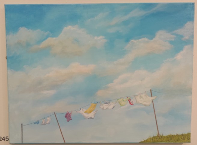 This oblique angle gives us a chance to glance over the laundry as it flutters in the slight breeze, and allows us to rest our eyes on that masterfully produced sky. The sky contains a good range of white and blue tones, where the interplay of light and colour make a very realistic rendering of the usual cloudscape that appears overhead whenever laundry is drying. This picture is nice, slightly odd, but at the same time reassuringly familiar and homely in its content and context.
