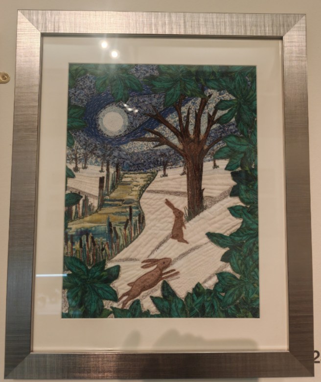 The manner of construction of the artworks sky, utilising differing textiles with quite different patterns and completely different looking textures adds a real depth to this work. It appears as though a moon is enveloped within a cloud, in a sky which has dark patches but the swirly fog-like etheriality adds gracefully to its mystique. The river leading up to that sky, in its own way transforms the entire context of the image from a close up scene of hares playing in a forest glade, to a full landscape with all of the depth and complexity which you would expect from a photograph.