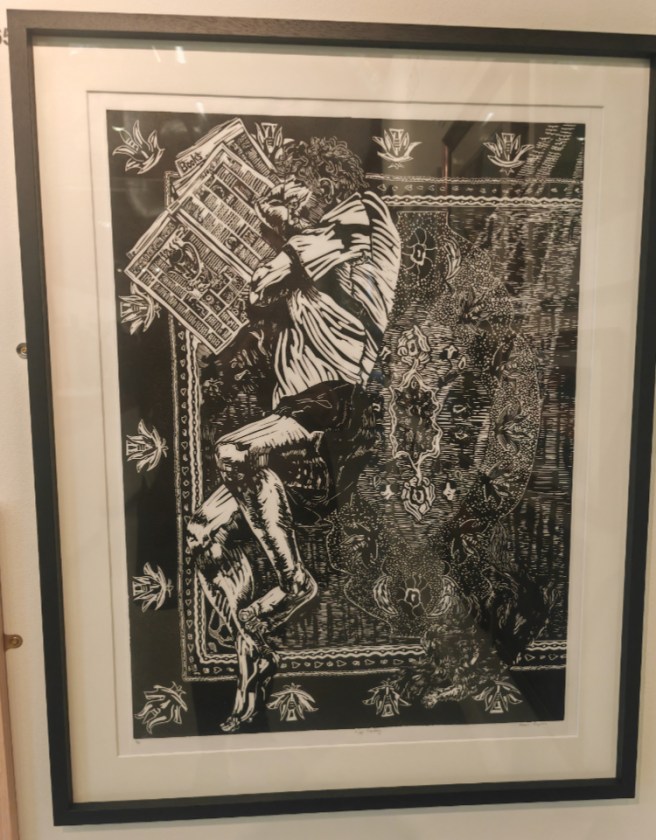 This lino-cut print is absolutely amazing. It’s size, complexity, style and attention to detail are all incredible. The scale of this artwork is large, much bigger than any other linocut print I have ever seen. The quality of the printing is fantastic too, with good sharply delineated lines, very little ink run into spaces where it isn’t meant to be. The only down side to this print from a viewers perspective is that the dog in the lower right of the artwork is that it is difficult to make out, It is dark, against a dark background.
