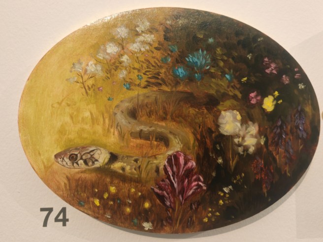 On Jenni Hawkins website, she shows this very same painting, however it is displayed with another equally small panel of a plum. It has them displayed with the snake low down, but the plum high up, in a bright space, surrounded by light. I feel that this display better represents the painting(s); and that the display with the plum makes the overall feel and viewers interpretation of this painting change completely. It’s no longer about the snake, but feels as though two windows have been cut into a bigger picture, giving two of the tiniest glimpses into a larger scene, leaving a whole expanse of this scene completely to the viewers imagination.